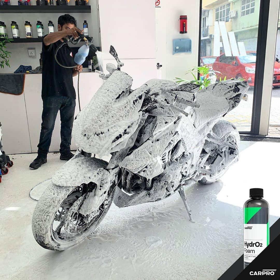 One of our greatest innovations of all time (HydrO2) has now evolved to save you even more time than before. CARPRO HydrO2 Foam is a pH-neutral surfactant designed to gently lift and remove dirt from solid surfaces in a safe and effective manner. HydrO2 Foam was designed with a special lifting lubricant that not only allows the dirt to be lifted from the surface but also provides lubrication to safely wash the paint when used as directed. In the tradition of our HydrO2 line, HydrO2 Foam was formulated with hydrophilic glass fibers, fluoropolymers and can be applied to all solid vehicle surfaces. Paint, glass, plastic, wheels, calipers and wheel wells are all easily within reach with HydrO2 Foam. This amazing combination of a rich foam wash and sealant lifts dirt whilst in the merino wool wiping stage and immediately forms an ultra-hydrophobic coating during the rinse phase. This results in a durable silica shell that produces a brilliant shine that is incredibly easy to maintain. Our hydroelectric bonding function means the pressure from water spraying accelerates bonding of the glass-like shell to the surface, creating a unique glossy coat, that is resistant to nearly all acids, alkaline solutions and solvents while offering significant UV protection.