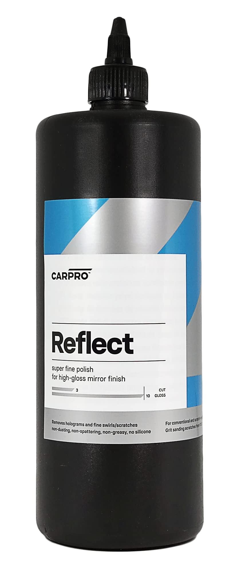 CARPRO Reflect is one of the most advanced finishing polishes on the market. With a proprietary blend of fine rapidly-diminishing abrasives and sophisticated nano-abrasives, Reflect quickly removes holograms and light wash marring, revealing an intensely glossy finish. Tested and honed by detailers all over the world, Reflect has all the features that both hobbyists and professionals desire: supreme ease of use, fast working times, zero filling or masking of defects, consistent results on both hard and soft paint types, and a highly Reflective mirror-like appearance that subsequently earned the polish its name. Welcome to the future of paintwork finishing technology.