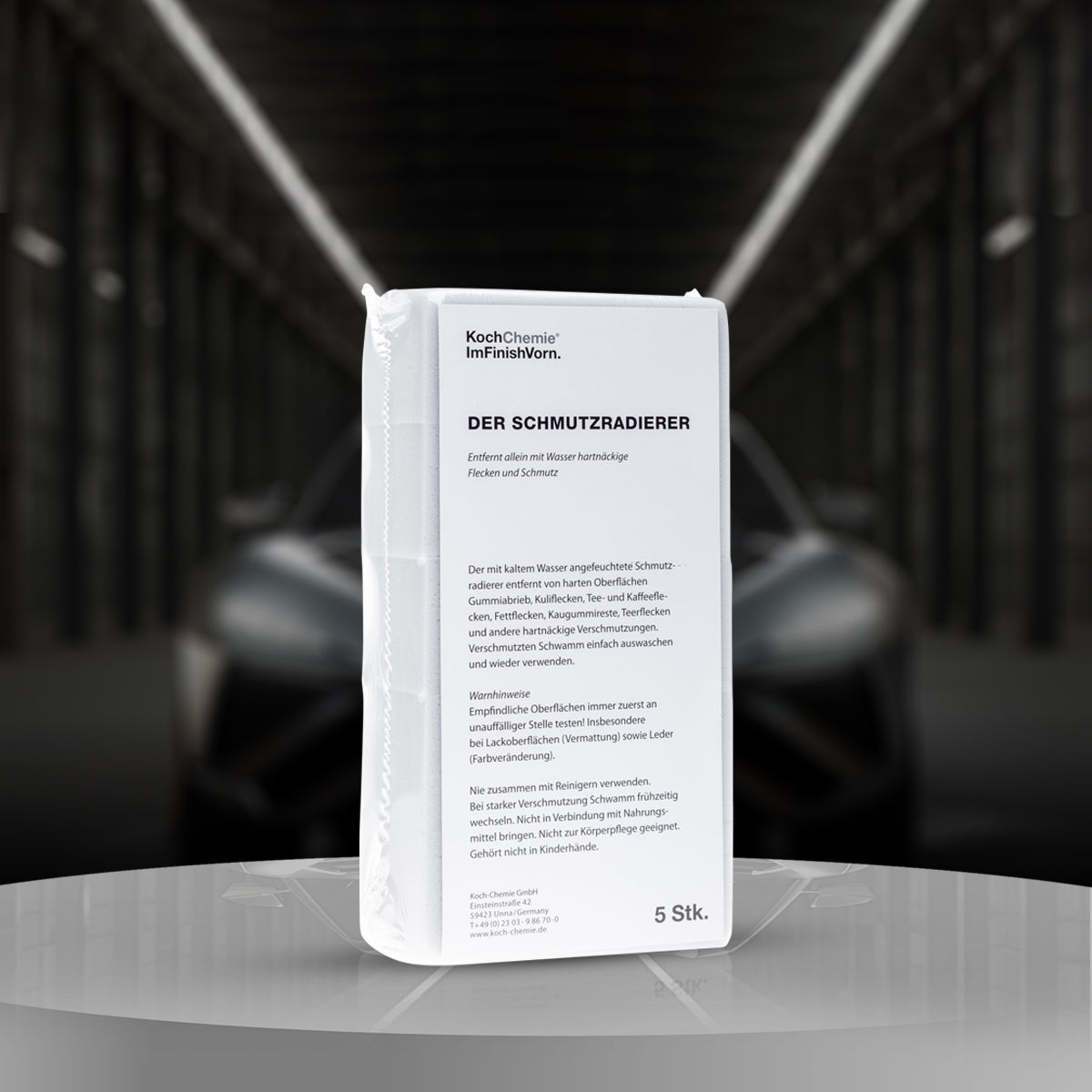Introducing the Koch Chemie Dirt Eraser, a strong tool for professional vehicle detailing. This abrasive sponge, made in Germany since 1968, is designed to quickly remove tough stains and debris from hard surfaces.
