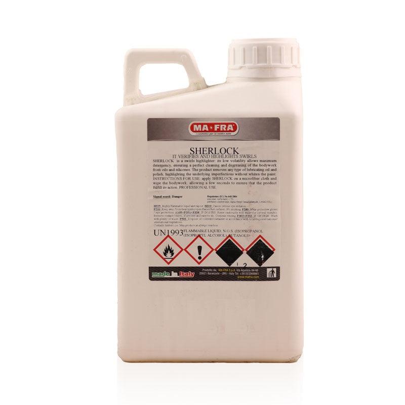 SHERLOCK is a swirls identifier. Its low volatility allows maximum cleaning, ensuring perfectly cleaned bodywork, degreased from oils and silicones. The product removes any type of lubricating oil and polish, highlighting the underlying imperfections without whitening the paint.